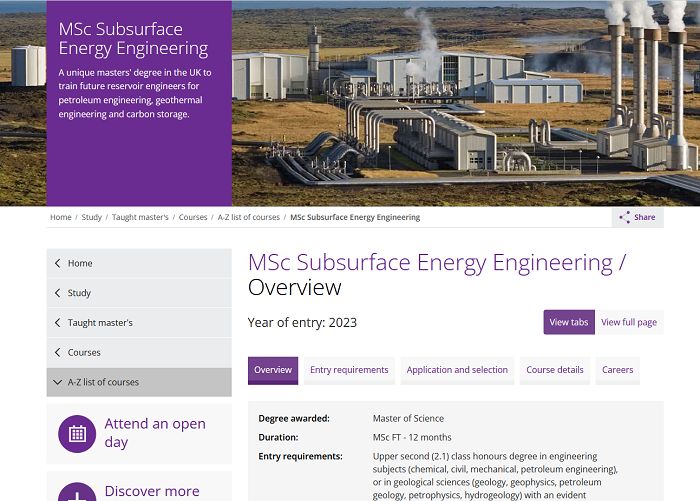地下能源工程碩士課程是曼徹斯特大學的熱門專業(yè)之一,隸屬于化學工程與分析科學系。核心必修課程有數(shù)值建模和仿真基礎、地下物理化學過程、地下流體的性質(zhì)、應用地下地球科學基礎等等。學生畢業(yè)后主要會進入石油和石化公司、化學工藝公司、軟件工程、咨詢公司等等。
