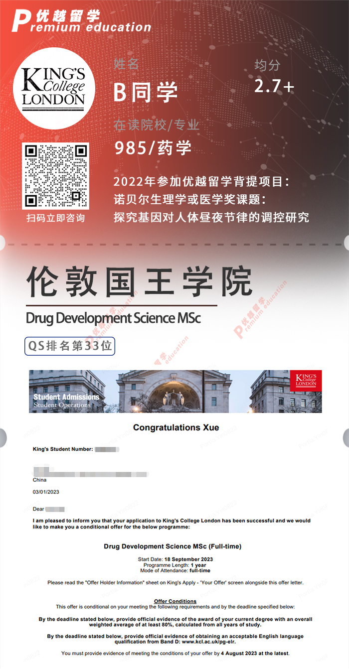 2023offer:恭喜白同學(xué)獲得倫敦國(guó)王學(xué)院藥物開發(fā)科學(xué)碩士通知書