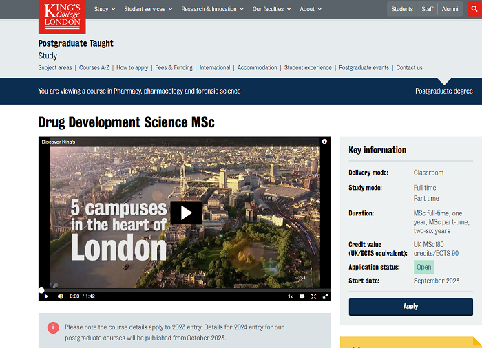 21/22學(xué)年,此專業(yè)錄取率達(dá)74%。23fall的錄取要求為醫(yī)學(xué)學(xué)位,藥學(xué)、藥理學(xué)、生物學(xué)、生物化學(xué)、化學(xué)或相關(guān)學(xué)科的 2:1 第一學(xué)位,或海外同等學(xué)力。雅思總分最低要求6.5分,單項(xiàng)不低于6.0。