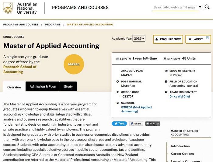 澳國立的應用會計碩士是一年期碩士項目,面向希望掌握必要的會計知識和技能,結(jié)合批判性分析和商業(yè)研究能力的本科畢業(yè)生。本課程專為具有商業(yè)或經(jīng)濟學學科先前研究的學生設(shè)計,并為他們提供核心會計領(lǐng)域的強大知識基礎(chǔ)和頂點課程的選擇。曾學習過會計學的同學也可以選擇學習高級會計課程,包括公共部門會計、稅務和審計方面的專業(yè)選修課。
