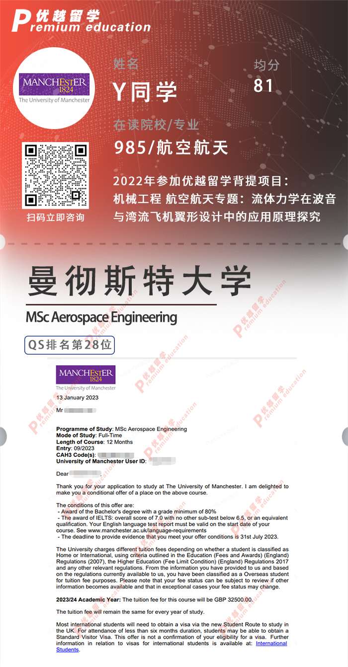 2023offer:恭喜Y同學(xué)在碩士留學(xué)申請中獲得曼徹斯特大學(xué)航空航天工程碩士通知書