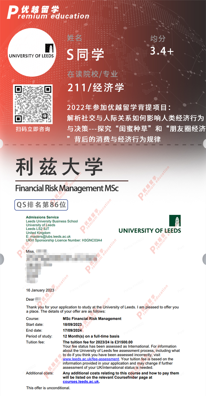 2023offer:恭喜S同學(xué)在碩士留學(xué)申請(qǐng)中獲得利茲大學(xué)金融風(fēng)險(xiǎn)管理碩士通知書(shū)。