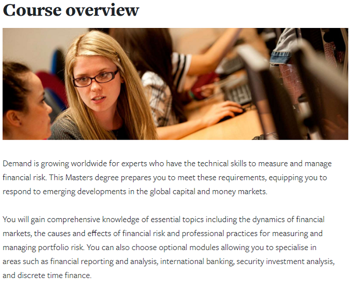 目前全球范圍內(nèi)對(duì)有能力衡量和管理金融風(fēng)險(xiǎn)的專業(yè)人士的需求正在增長(zhǎng)。該碩士項(xiàng)目幫助學(xué)生培養(yǎng)著方面專業(yè)技能,來(lái)應(yīng)對(duì)全球資本和貨幣市場(chǎng)的新興發(fā)展。本課程的畢業(yè)生具備在金融領(lǐng)域從事風(fēng)險(xiǎn)管理、信用風(fēng)險(xiǎn)分析、衍生品、保險(xiǎn)和金融研究等職業(yè)選擇的技能和知識(shí)。以前的畢業(yè)生后來(lái)在各種金融機(jī)構(gòu)、投資銀行、監(jiān)管機(jī)構(gòu)和標(biāo)準(zhǔn)制定者、國(guó)際保險(xiǎn)公司、資產(chǎn)管理公司、承銷商和投資基金工作。