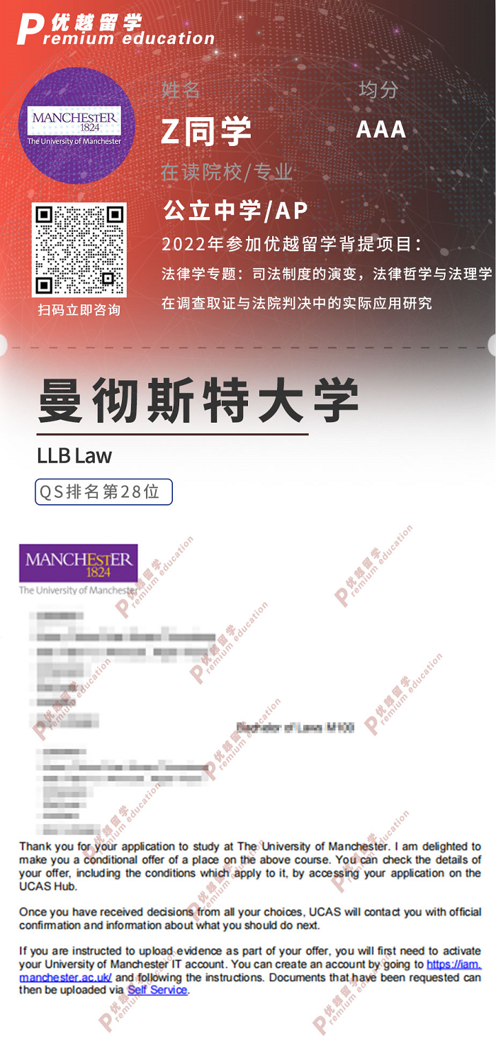 2023offer:恭喜Z同學(xué)在本科本科留學(xué)申請(qǐng)中獲得曼徹斯特大學(xué)法律專業(yè)通知書。