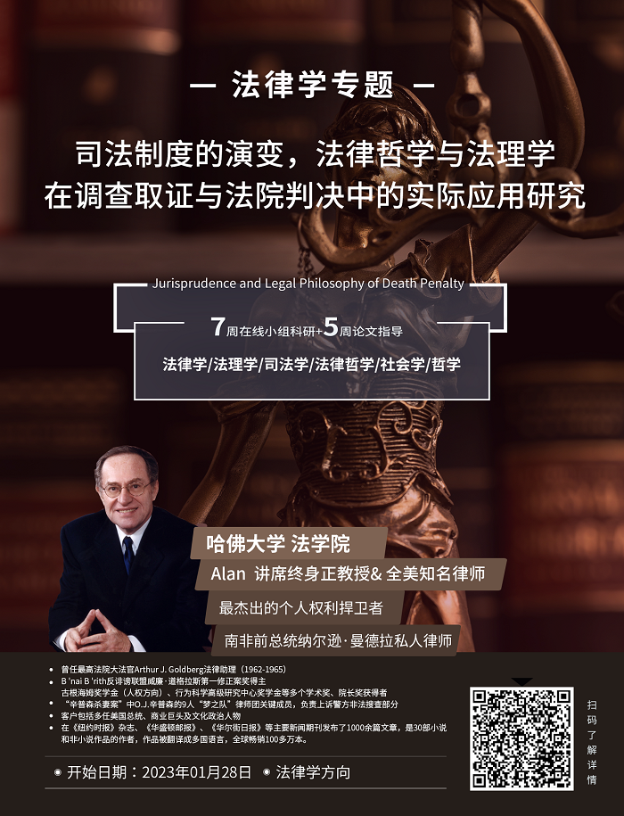 1.該項(xiàng)目適合法律、法學(xué)、法理學(xué)、刑法、法律哲學(xué)、政治哲學(xué)、社會(huì)學(xué)、憲法、民法等專業(yè)或希望修讀相關(guān)專業(yè)的學(xué)生;建議學(xué)生需要具備法律事務(wù)與政策背景知識(shí)。項(xiàng)目導(dǎo)師是哈佛大學(xué)法學(xué)院講席終身正教授,也是全美知名律師。
