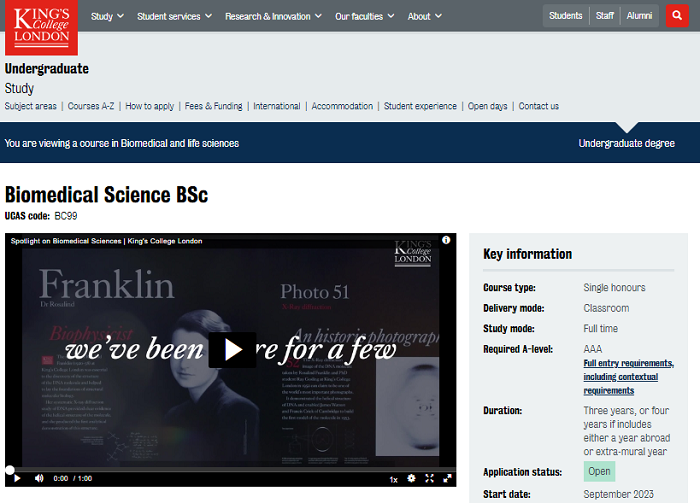 生物醫(yī)學(xué)科學(xué)理學(xué)士跨學(xué)科學(xué)位是KCL最受歡迎的生物科學(xué)課程,每年有超過300名學(xué)生入學(xué)。該課程始終提供高質(zhì)量的教學(xué),學(xué)生可以選擇個人科學(xué)優(yōu)勢和興趣的學(xué)位課程。本課程是生物科學(xué)教育學(xué)院“Common Year 1”系列課程的一部分。該套件中的其他程序是解剖學(xué)、發(fā)育和人類生物學(xué);生物化學(xué);醫(yī)學(xué)生理學(xué);分子遺傳學(xué);神經(jīng)科學(xué);和藥理學(xué)。成功完成第一年后,學(xué)生可以選擇切換到該套件中的另一個程序。在第2年,學(xué)生可以選擇在學(xué)校的合作機(jī)構(gòu)之一出國學(xué)習(xí)一個學(xué)期?;蛘呖梢陨暾堅诘诙旰偷谌曛g在通常是在國外或校外領(lǐng)先的生物醫(yī)學(xué)雇主那里學(xué)習(xí)一年。