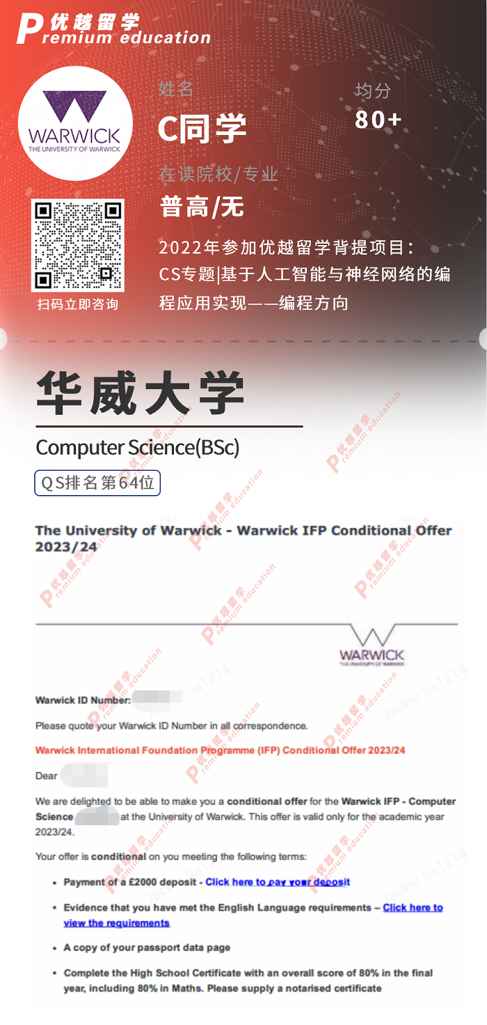 2023offer:恭喜C同學(xué)在本科留學(xué)申請中獲得華威大學(xué)計(jì)算機(jī)科學(xué)專業(yè)通知書。