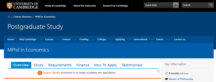 經(jīng)濟(jì)學(xué)院學(xué)術(shù)要求高,符合要求的申請(qǐng)者眾多。申請(qǐng)人應(yīng)已獲得或期望獲得經(jīng)濟(jì)學(xué)高二等本科(或國(guó)家同等學(xué)歷)資格。該學(xué)位應(yīng)包括中級(jí)微觀經(jīng)濟(jì)學(xué)、宏觀經(jīng)濟(jì)學(xué)和計(jì)量經(jīng)濟(jì)學(xué)的標(biāo)準(zhǔn)課程(商業(yè)研究、會(huì)計(jì)學(xué)或管理學(xué)學(xué)位或資格證書(shū)不能提供足夠的背景)。如果不符合以下的標(biāo)準(zhǔn),則不太可能獲得名額。