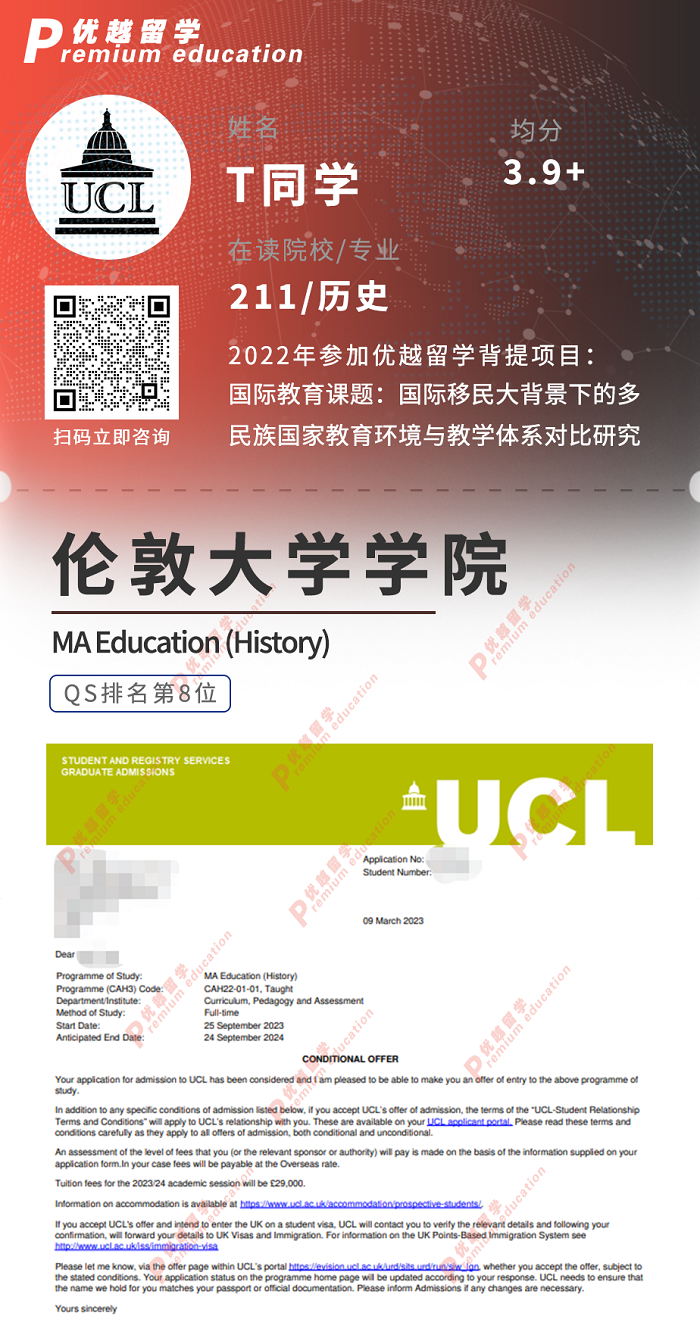 2023offer來襲!恭喜T同學(xué)在碩士留學(xué)申請(qǐng)中斬獲倫敦大學(xué)學(xué)院教育學(xué)(歷史)碩士通知書!