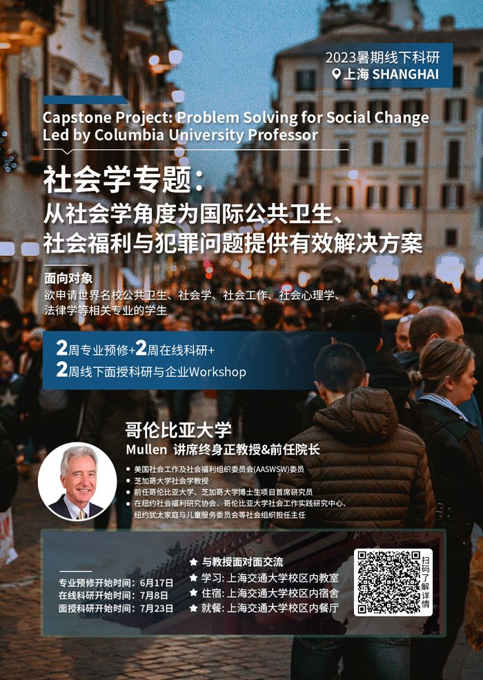 2.疫情肆虐,國際局勢動蕩,不斷迸發(fā)的社會問題亟待探討,對于從事社會工作的學生和學者來說也意味著不小的挑戰(zhàn), 本項目將通過介紹不同的社會工作研究方法來為學生們打下對于人類行為觀察能力以及對于社會問題分析能力的堅實基礎。學生將通過閱讀社會工作調(diào)研相關的文章,進行批判性思考。