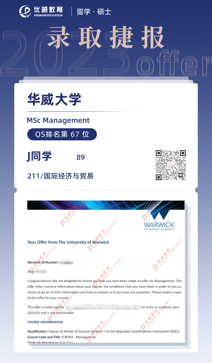 2023offer來(lái)襲!恭喜J同學(xué)在碩士留學(xué)申請(qǐng)中斬獲華威大學(xué)管理學(xué)碩士通知書!