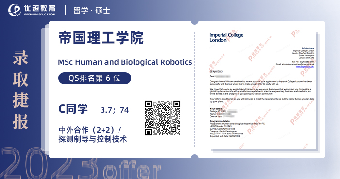 2023offer來襲!恭喜C同學(xué)在碩士留學(xué)申請中斬獲帝國理工學(xué)院人類和生物機(jī)器人碩士通知書!