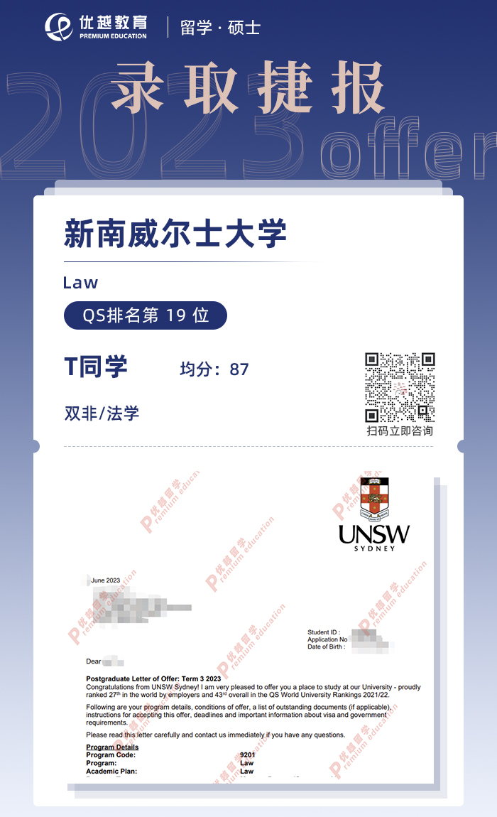 2023offer來(lái)襲!恭喜T同學(xué)在碩士留學(xué)申請(qǐng)中斬獲新南威爾士大學(xué)法學(xué)碩士通知書(shū)!