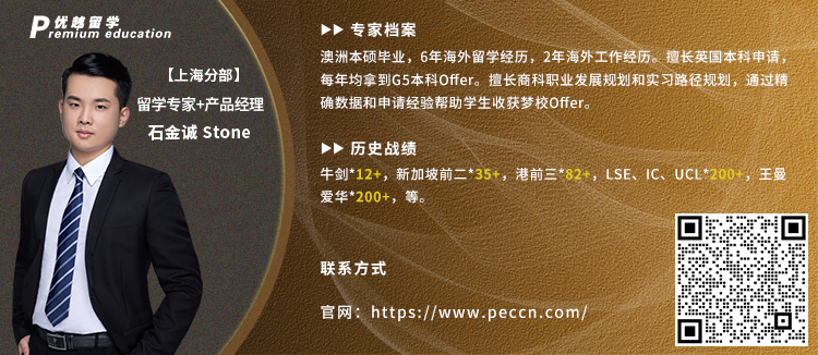 本案例的留學(xué)顧問是優(yōu)越北京上海的Stone老師,澳洲本碩畢業(yè),6年海外留學(xué)經(jīng)歷,2年海外工作經(jīng)歷。Stone老師擅長英國本科申請,每年都有G5本科Offer的成功經(jīng)驗(yàn)。而且擅長商科職業(yè)發(fā)展規(guī)劃和實(shí)習(xí)路徑規(guī)劃,通過精確數(shù)據(jù)和申請經(jīng)驗(yàn)幫助學(xué)生收獲夢校Offer。