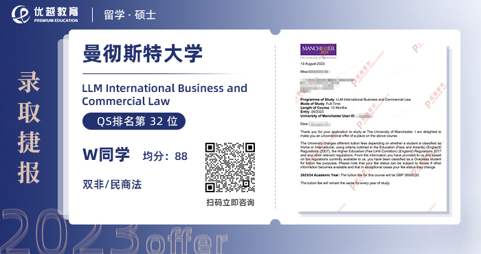 2023offer來襲!恭喜W同學(xué)在碩士留學(xué)申請中斬獲曼徹斯特大學(xué)國際商法碩士通知書!