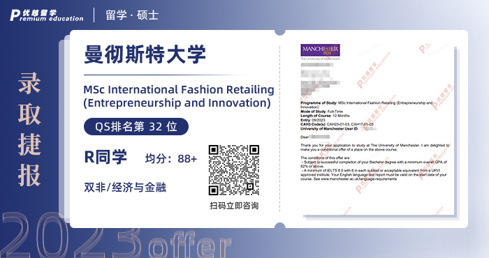 2023offer來(lái)襲!恭喜R同學(xué)在碩士留學(xué)申請(qǐng)中斬獲曼徹斯特大學(xué)國(guó)際時(shí)尚零售(創(chuàng)業(yè)與創(chuàng)新)碩士通知書(shū)!