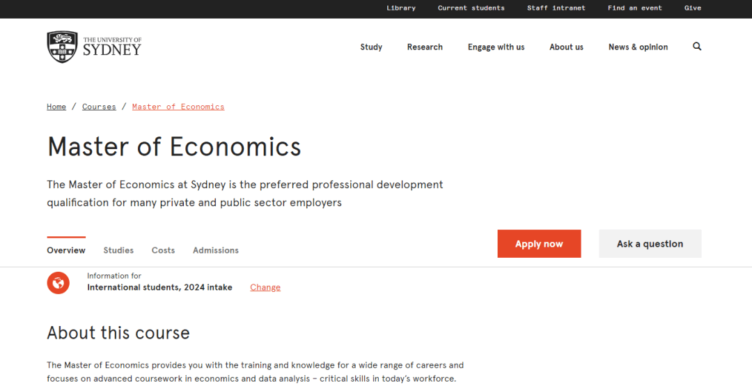 悉尼大學的經(jīng)濟學碩士課程專為應屆畢業(yè)生以及為職業(yè)發(fā)展或轉行而尋求進一步經(jīng)濟學培訓的專業(yè)人士而設計,鼓勵學生以實用的方式應用所學知識,應對商業(yè)和政策領域的重大挑戰(zhàn)。經(jīng)濟學碩士課程為學生提供從事各種職業(yè)所需的培訓和知識,重點是經(jīng)濟學和數(shù)據(jù)分析方面的高級課程,這些都是當今勞動力市場的關鍵技能。