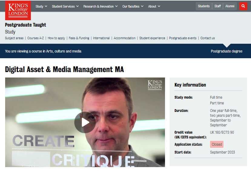 該數(shù)字資產(chǎn)和媒體管理碩士課程旨在幫助學(xué)生為私營(yíng)、公共和第三部門(mén)的DAMM相關(guān)職業(yè)做好準(zhǔn)備。由于它主要是一門(mén)基于實(shí)踐的學(xué)科,學(xué)生因此可以在核心模塊中獲得使用企業(yè)級(jí)DAM軟件的實(shí)踐經(jīng)驗(yàn)。核心課程模塊包含數(shù)字資產(chǎn)的設(shè)計(jì)、創(chuàng)建、文檔、出版、管理和保存相關(guān)的關(guān)鍵想法、挑戰(zhàn)、流程和技術(shù)等知識(shí)。學(xué)生能夠通過(guò)回顧案例研究和理論,形成對(duì)數(shù)字資產(chǎn)和媒體管理的批判性和反思性觀點(diǎn),并以此來(lái)檢查數(shù)字學(xué)術(shù)、技術(shù)和策展最佳實(shí)踐之間的相互依賴(lài)性。