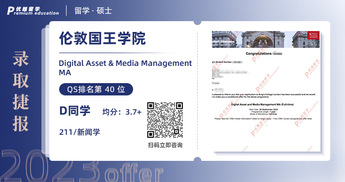 2023offer來(lái)襲!恭喜D同學(xué)在碩士留學(xué)申請(qǐng)中斬獲倫敦國(guó)王學(xué)院數(shù)字資產(chǎn)與媒體管理碩士通知書(shū)!