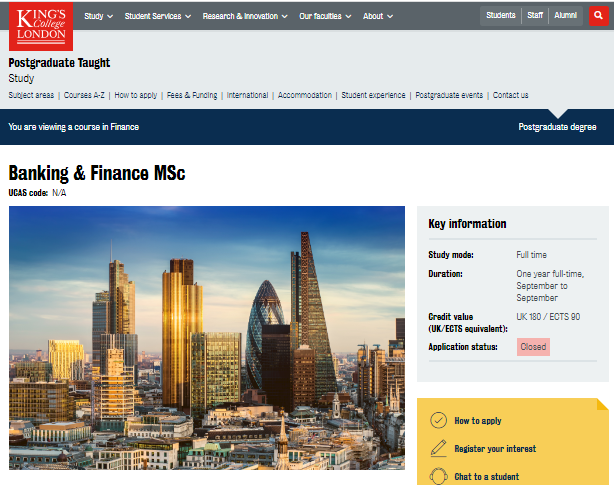 該課程旨在為學(xué)生在銀行和金融行業(yè)打造卓越的職業(yè)生涯。探討金融市場(chǎng)和全球銀行業(yè)面臨的挑戰(zhàn),揭示復(fù)雜的金融原理和數(shù)據(jù)應(yīng)用對(duì)投資問題的復(fù)雜性,透徹了解銀行和金融市場(chǎng)的許多復(fù)雜且具有挑戰(zhàn)性的方面,課程專門為學(xué)生提供這些基本技能而設(shè)計(jì)。國王商學(xué)院的銀行與金融理學(xué)碩士提供全面的金融教育,包括商業(yè)和投資銀行、金融衍生品、風(fēng)險(xiǎn)管理、金融監(jiān)管和行為金融學(xué)。