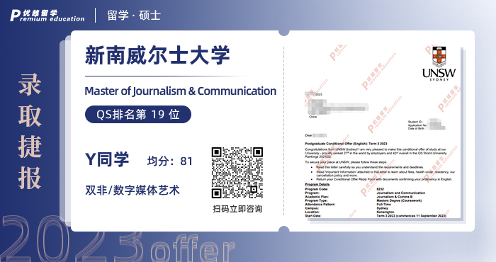 2023offer來襲!恭喜Y同學在碩士留學申請中斬獲新南威爾士大學新聞與傳播碩士通知書!