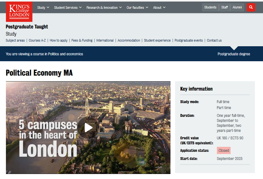 對于中國申請人來說,來自985、211、雙一流院校的學生要求均分不低于80。來自其他院校的學生要求均分不低于85。2024申請季KCL政治經濟學碩士通常只考慮985/211/雙一流院校的申請人。