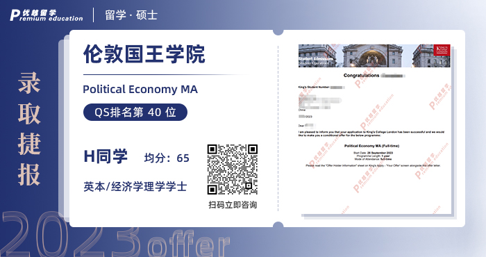 2023offer來襲!恭喜H同學在碩士留學申請中斬獲倫敦國王學院KCL政治經濟學碩士通知書!