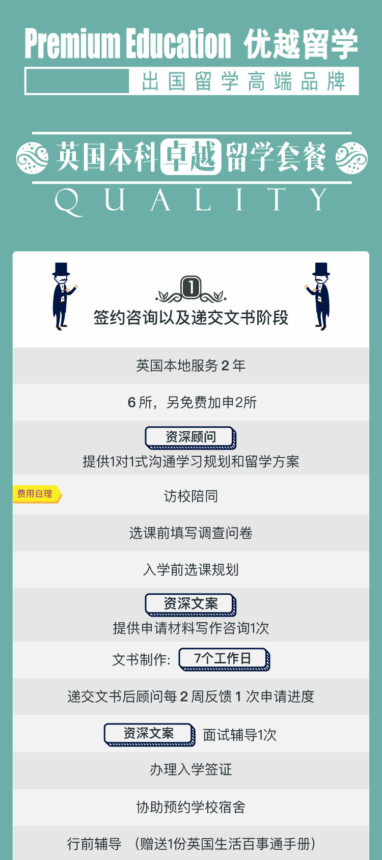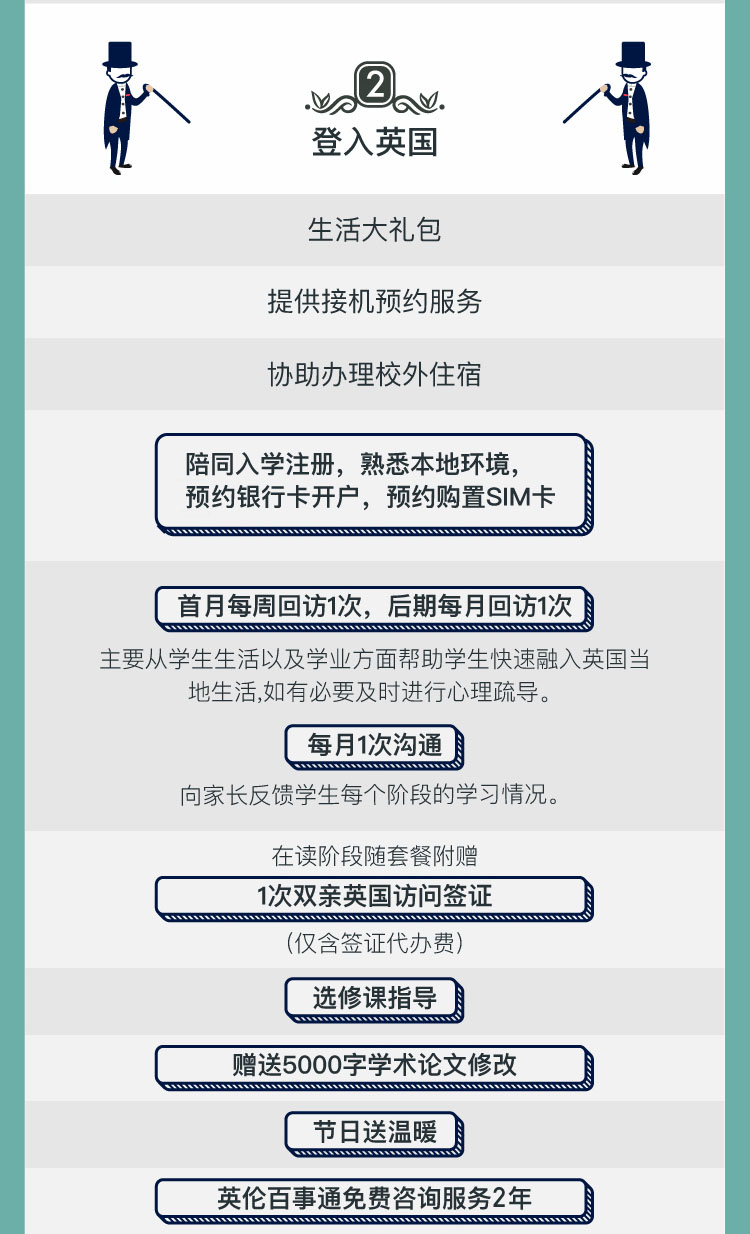 在原有6所學(xué)校的基礎(chǔ)上再加升2所,給您更多的選擇。資深顧問提供1對(duì)1式溝通學(xué)習(xí)規(guī)劃及留學(xué)方案,選擇最適合的學(xué)校及專業(yè)。資深文案提供1次申請(qǐng)材料寫作,高效提升申請(qǐng)通過率。后期文書制作工作日縮短至7個(gè)工作日,降低您等待中的焦慮心情。提供接機(jī)預(yù)約服務(wù),并協(xié)助辦理校外宿舍,為您的出行提供省時(shí)、省心,超便捷的服務(wù)。詳細(xì)全面的行前輔導(dǎo),使學(xué)生們快速了解并融入英國當(dāng)?shù)厣睢?strong>陪同入學(xué)注冊(cè)、熟悉本地環(huán)境、預(yù)約銀行開戶及辦理SIM卡;為初入英國的您解決一切顧慮,真正做到無憂出行。首月每周進(jìn)行一次回訪,后期將每月回訪一次。為了讓遠(yuǎn)在國內(nèi)的家長們及時(shí)了解孩子的動(dòng)態(tài),每月與家長進(jìn)行一次溝通,具體了解學(xué)生每個(gè)階段的學(xué)業(yè)情況,讓家長安心。1次雙親英國訪問簽證。每年贈(zèng)送5000字學(xué)術(shù)論文修改,節(jié)日及時(shí)送出溫暖服務(wù)進(jìn)行關(guān)懷,提供留學(xué)貸款;并提供二年的英倫百事通咨詢服務(wù),讓您無需顧慮學(xué)業(yè)外的任何生活瑣事。